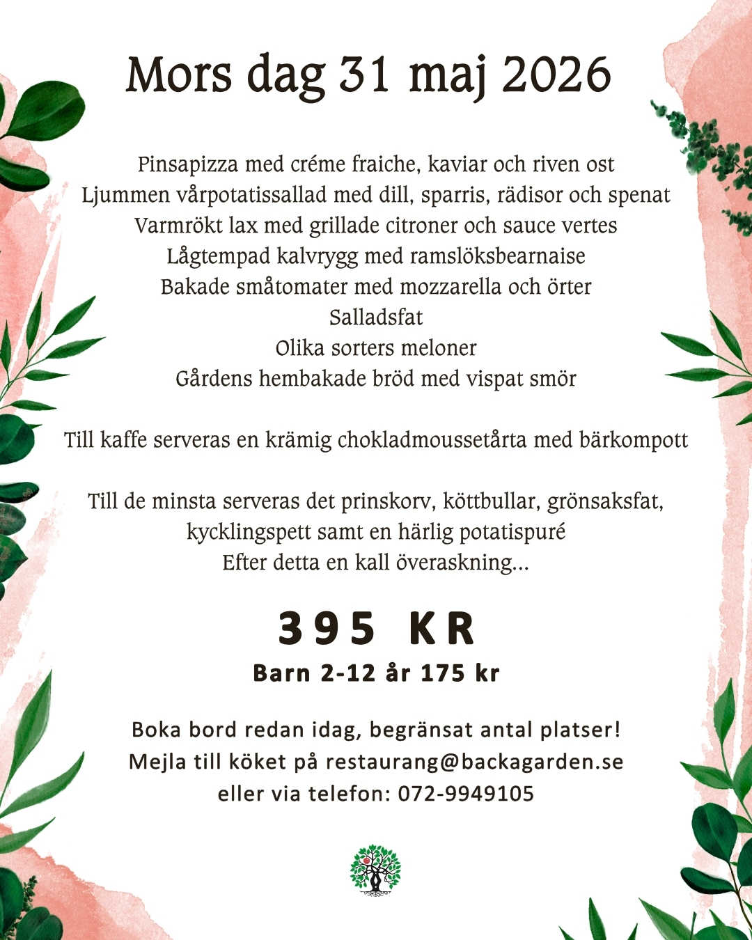 restaurang@backagarden.se eller via telefon: 0729-949105